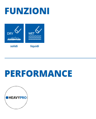 L’ampio set di accessori professionali in dotazione rende possibile l’utilizzo di questo aspiratore solidi liquidi in molteplici situazioni. Nella confezione sono presenti: corpo spazzola (ø40), inserto spazzola liquidi, inserto spazzola solidi, spazzola rotonda, bocchetta piatta (ø40), tubo acciaio dritto (ø40), tubo acciaio curvo (ø40), tubo flessibile completo (2,5 m), filtro in poliestere (ø440), filtro spugna per liquidi.