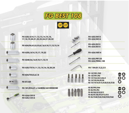 Il set Fasano Tools FG 108 (conosciuto come "Best 108") rappresenta il punto di incontro perfetto tra completezza e praticità. Realizzato per resistere agli utilizzi più gravosi, questo kit offre una selezione accurata di bussole e inserti in Acciaio al Cromo Vanadio, garantendo una precisione millimetrica e una resistenza superiore all'usura e alla corrosione.